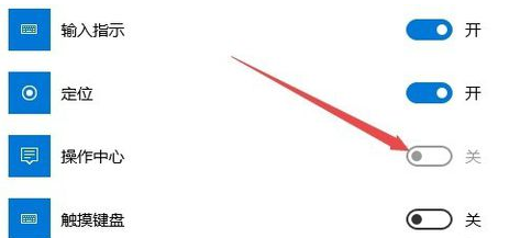 1,我们先来看一下设置窗口中操作中心的开关为灰色的,现在无法点击,无法打开。