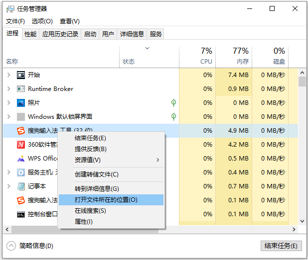 1、打开任务管理器,右键点击“进程”下的广告名,选择“打开文件所在位置”。
