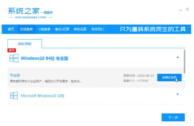 1.首先电脑上下载安装系统之家一键重装系统工具并打开,选择需要安装的win10系统,点击安装系统。(安装前注意备份重要信息,关掉电脑上的杀毒软件,避免被拦截)
