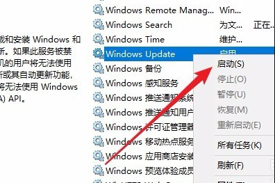 6、打开 Windows服务窗口,右键点击Windows Update服务项,选择“启动”菜单项。