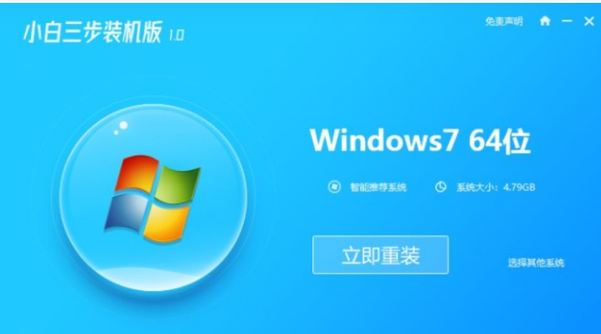 1、下载并打开小白三步装机版软件,软件会自动找到win7系统,我们就点击立即。一般会匹配win10系统,只需要在-其他系统-处更改为win7系统。