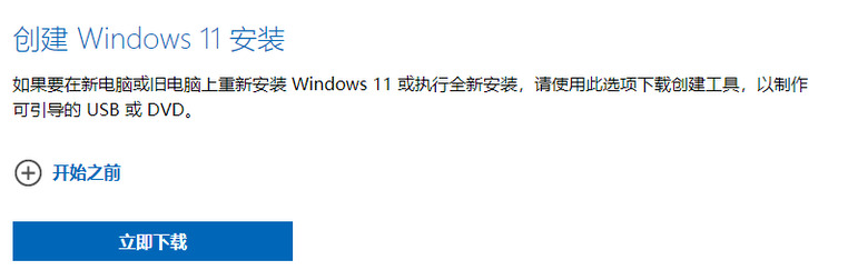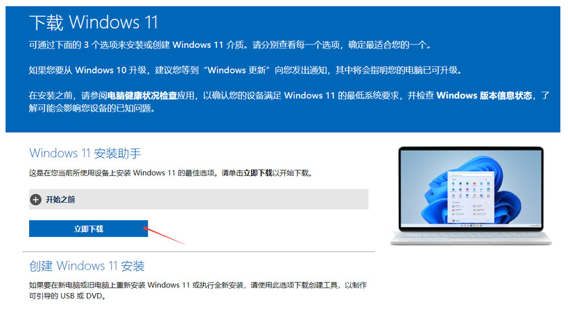 1、在浏览器中搜索并打开微软 Windows 11 升级官网,下载win11安装助手。下载完后打开软件,下载媒体创建工具;