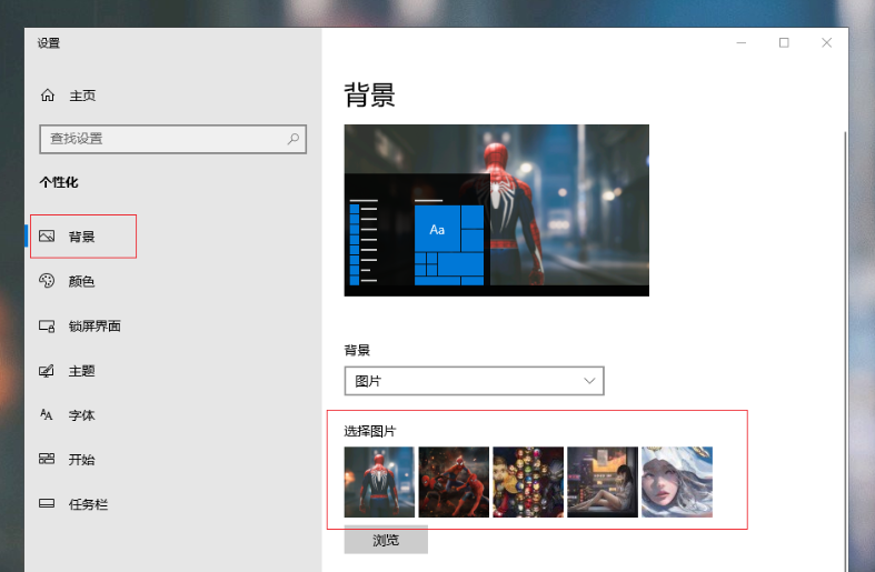 2、在左侧选择【背景】,然后右侧选择想要作为壁纸的照片,点击更换壁纸即可。