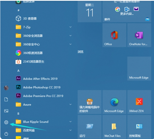 1、首先点击win10桌面左下方开始,点击“设置”打开。