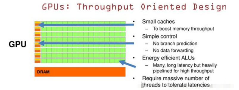 GPU的虽然有dram延时,却有非常多的ALU和非常多的thread. 为啦平衡内存延时的问题,我们可以中充分利用多的ALU的特性达到一个非常大的吞吐量的效果。尽可能多的分配多的Threads.通常来看GPU ALU会有非常重的pipeline就是因为这样。所以与CPU擅长逻辑控制,串行的运算。和通用类型数据运算不同,GPU擅长的是大规模并发计算,这也正是密码破解等所需要的。所以GPU除了图像处理,也越来越多的参与到计算当中来。