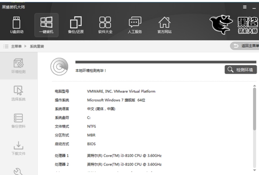 1、下载安装后打开黑鲨装机大师,点击上方一键装机,选择系统重装,软件会进入环境检测环节,检测结束后点击下一步。