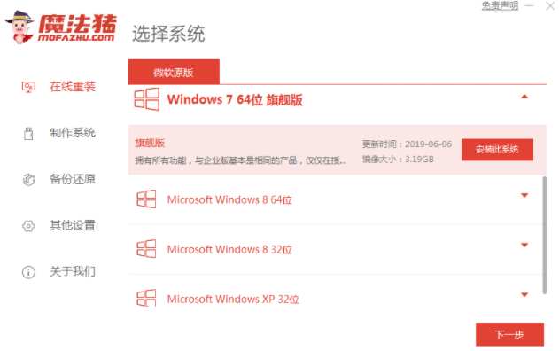 1.先下载并安装魔猪一键重装系统软件并打开,选择win10系统点击开始安装。(安装前注意备份c盘重要信息,关闭电脑杀毒软件。