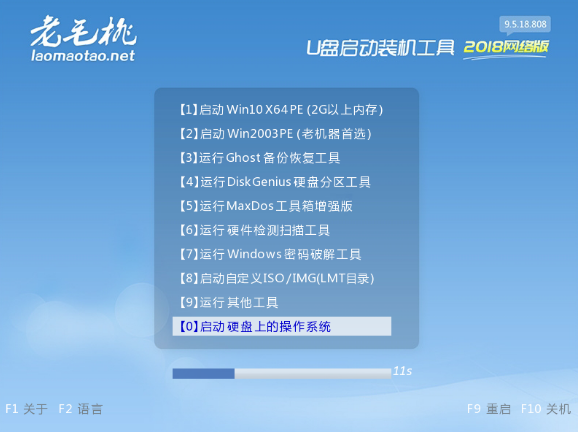 1、 插入U盘,开机或重启电脑,出现开机画面时,通过不断地按U盘启动快捷键进入老毛桃主菜单页面,选择【1】选项并回车确认