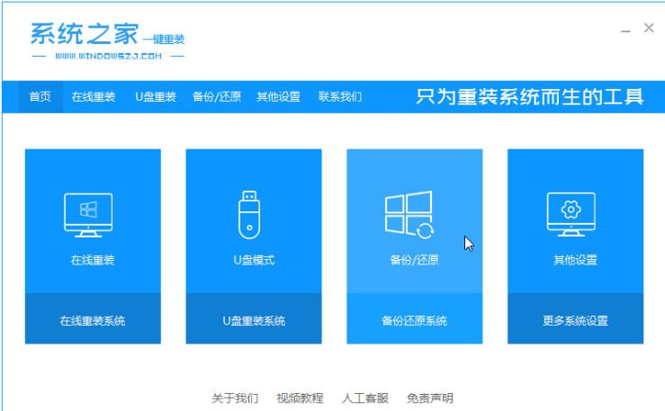 1、下载win7镜像解压到非系统盘,下载系统之家一键重装系统软件,点击[备份和还原]。(安装前备份好要的资料。)