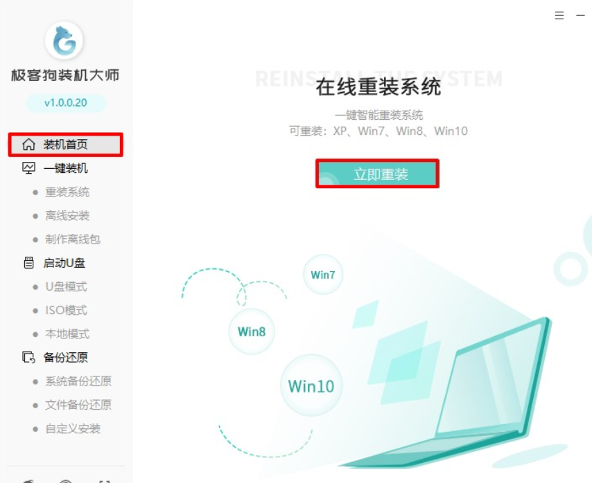 1、先下载极客狗装机大师软件,注意要关闭所有杀毒软件,再打开软件“立即重装”。极客狗装机大师会开始检测配置环境,点击“下一步”。