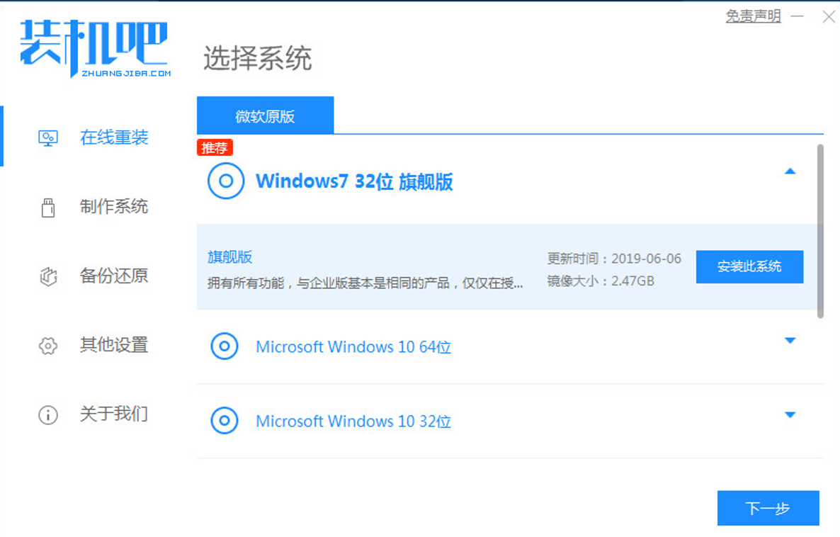 1、首先下载安装装机吧工具软件,选择要安装的系统,点击下一步。