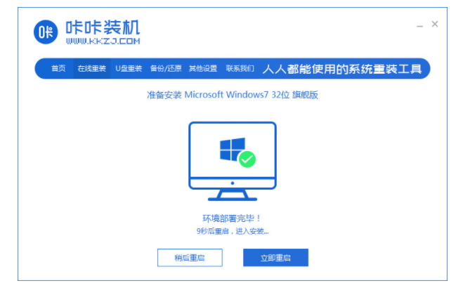 2、打开咔咔装机,选择在线重装栏目,点选需要安装的win7,点击安装此系统。