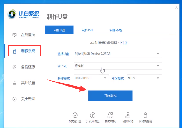 1、将空U盘插入电脑,打开小白一键重装系统软件,关闭杀毒工具(包括360安全卫士),等待小白检测环境完成后,点击制作系统,【开始制作】。