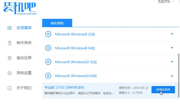 1、点击下载装机吧一键重装系统软件,打开软件,选择win10系统。
