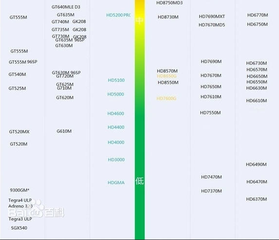 显卡的用途是将计算机系统所需要的显示信息进行转换驱动,并向显示器提供行扫描信号,控制显示器的正确显示,是连接显示器和个人电脑主板的重要元件,是“人机对话”的重要设备之一。 显卡作为电脑主机里的一个重要组成部分,承担输出显示图形的任务,对于从事专业图形设计的人来说显卡非常重要。 民用显卡图形芯片供应商主要包括AMD(ATI)和Nvidia(英伟达)两家。 下面就和大家分享一下显卡天梯图吧 以上就是和大家分享的显卡排行榜天梯图了,希望对大家有帮助。
