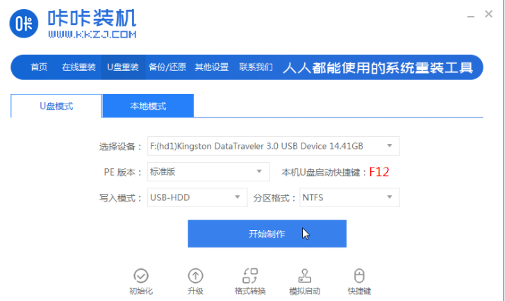 1.先下载安装咔咔一键重新装入系统工具并打开,插入8g以上空白u盘,选择u盘重装系统模式,点击开始制作。