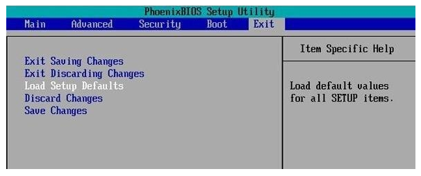 2.选择【Exit】菜单下面的【LoadSetupDefaults】并回车,选择【Yes】之后,再次回车。