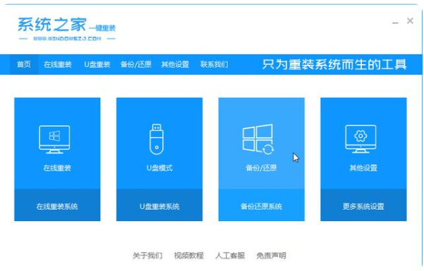 1,我们进入到电脑桌面之后,打开在桌面上的一个名为系统之家重装系统的软件,我们可以使用这个软件进入系统的还原操作,进入到首页当中,选中页面中的备份还原功能。