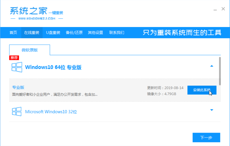 1、先在电脑上下载安装系统之家一键重装系统工具并打开,选择需要安装的win10系统,点击安装此系统。(注意在安装前备份好重要资料,关掉电脑上的杀毒软件避免被拦截)。
