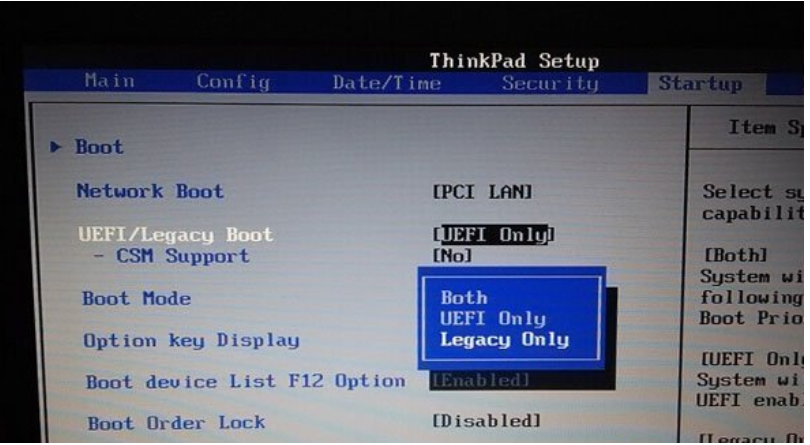3、进入Startup选项里面将“UEFI/Legacy Boot”选项选择为Legacy Only即可,这里如果没有更改Security boot无法更改,UEFI Only选项为灰色。