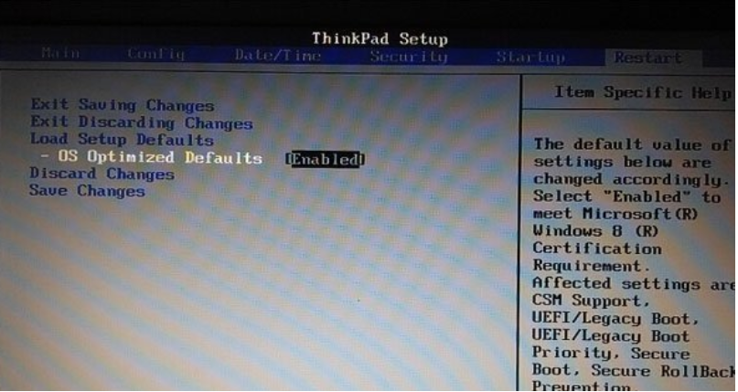 1、开机按F1进入bios,按← →键盘键,进入“Restart”选项卡。