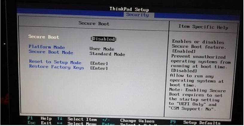 2、继续使用键盘将“Security”选项里的Security boot改成Disable,重启后再次进入bios。