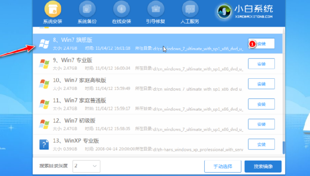 6、pe内,打开小白装机工具选择需要安装的系统执行安装,目标分区选择“C盘”。