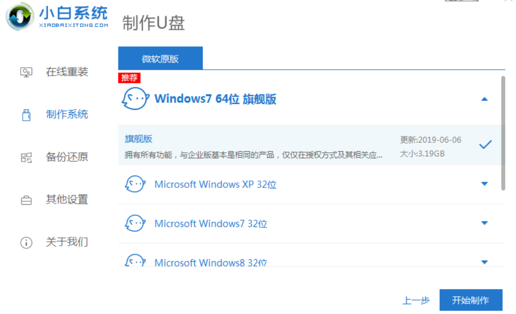 2、进入系统选择界面选择需要安装的系统,点击“开始制作”。