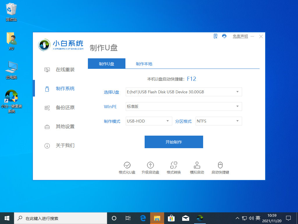 2. 打开制作系统选项(制作启动盘),选择好U盘后按默认参数点击开始制作。
