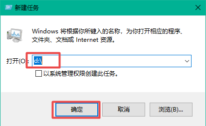 5.然后系统会弹出【新建任务】的窗口,在此窗口中我们输入【d:\】,然后点击【确定】按钮,就可以进入到电脑的D盘当中了。