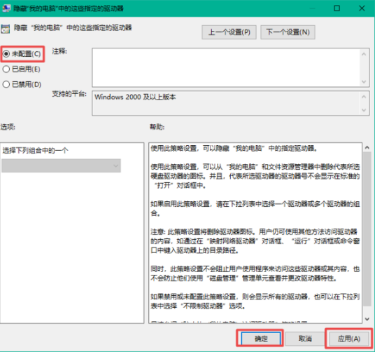 6,接着系统会弹出【隐藏我的电脑中的这些指定的驱动器】的窗口,然后我们选择【未配置】选项,然后点击【应用】按钮,再点击【确定】按钮即可。