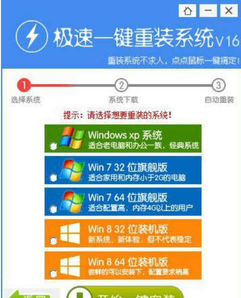 2、根据您个人喜好和电脑的配置选择需要重装的系统,选好之后直接点击【开始一键安装】,一般情况下单核处理器选择XP,双核和四核选择win7,小于2G内存选择32位,内存大于4G选择64位;