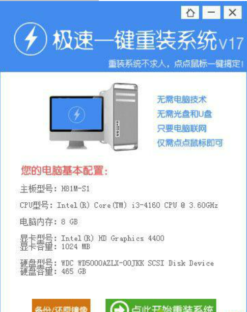 1、下载极速一键重装系统,之后打开主菜单,点击软件主界面的【点此开始重装系统】,如果你本机中已经有GHO镜像文件,则可以用【备份/还原系统】来还原;