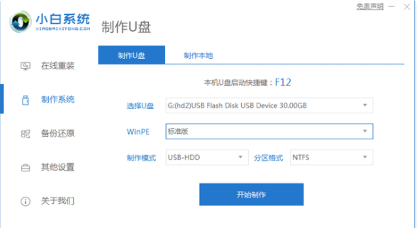 1、下载并运行好小白一键重装系统工具,插入u盘,选择u盘重装系统模式点击开始制作。
