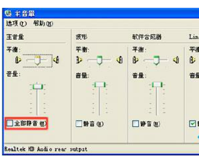 3、在“主音量”窗口中,取消选中“主音量”项目底部的“全部静音”框,以及其他项目下面的“静音”框。