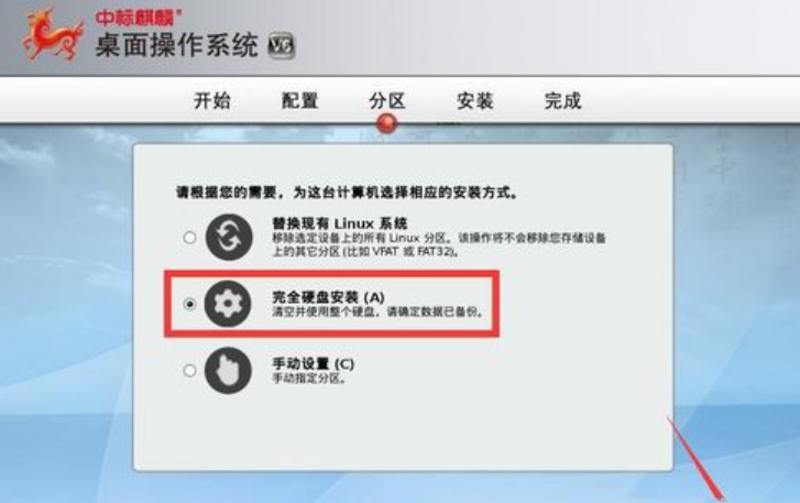 7.“分区”配置界面中,选中“硬盘完全安装”项目。
